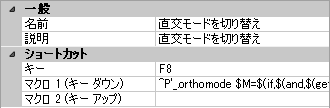 - [マクロ 2 (キー アップ)]ボックスに、一時優先キーを放したときに実行されるマクロを入力します。値を定義しない場合、キー アップすると、アプリケーションと図面の設定は前の状態(一時優先が実行される前の状態)に復元されます。