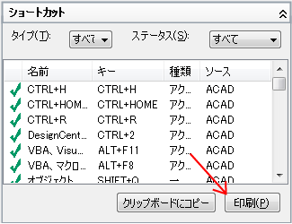 - [ショートカット]ペインで、印刷するキーボード ショートカットのタイプとステータスをフィルタします。