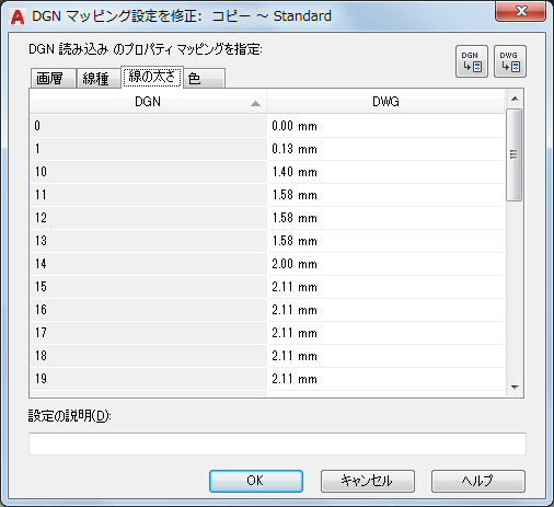 DGN ファイルと DWG ファイル内で使用されている最も一致する一連の定義済みの線の太さが表示されます。右側の列で右クリック メニューを使用して 1 つまたは複数の線の太さをコピーして貼り付けることができます。変更できるのは、[線の太さ]タブの右側の列のみです。左側の列を編集することはできません。