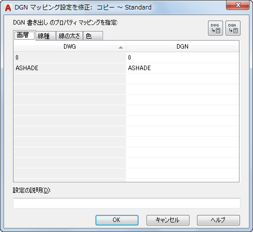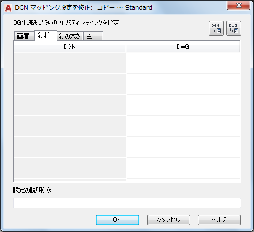 マッピング設定を書き出す: [DGN 書き出し設定]ダイアログ ボックスから新しい設定を作成して[DGN マッピング設定を修正]ダイアログ ボックスにアクセスすると、[DWG]列には、現在の図面ファイル内で定義されているすべての線種が一覧表示されます。目的のセル(右側の列)が空白の場合は、常に既定のシステム マッピングが使用されます。