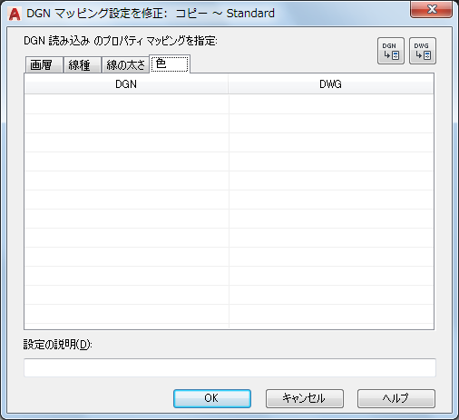 既存のマッピング設定: 既存のマッピング設定を編集している場合([DGN 読み込み設定]または[DGN 書き出し設定]ダイアログ ボックスを使用して Standard 以外の設定を編集している場合であっても)、マッピング テーブルに一覧表示されるプロパティは、読み込まれる DGN ファイルまたは書き出される図面ファイルから取得されません。