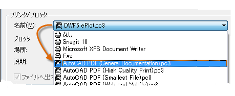 [プリンタ/プロッタ]ドロップダウン リストから、 [AutoCAD PDF (General Documentation).pc3] を選択します。