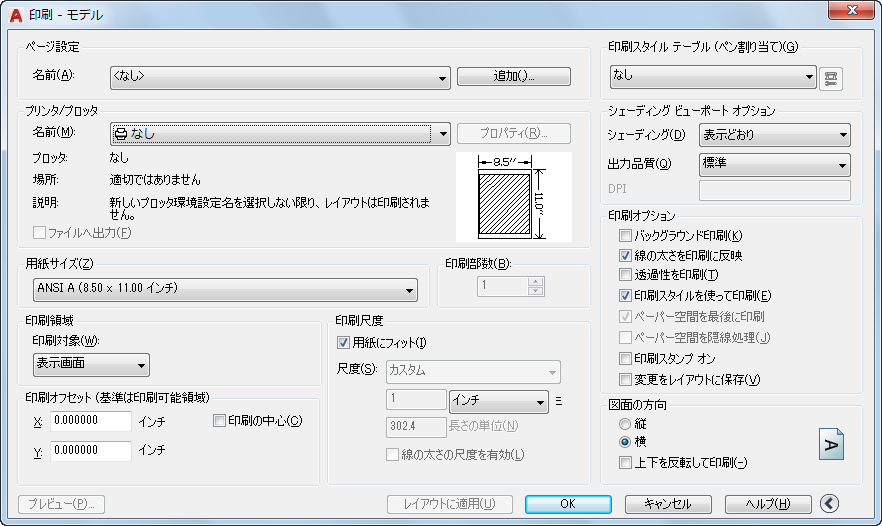 印刷の設定作業が簡単になるように、このような設定の集まりを保存し、名前で呼び出すことができます。これを「ページ設定」と呼んでいます。 ページ設定を使用することで、異なるプリンタでの印刷、グレースケールでの印刷、図面からの PDF ファイルの作成などに必要な設定を格納することができます。