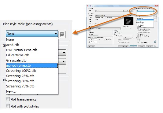 印刷スタイル テーブルは、色の処理に関する情報を提供します。モニタでは適切に表示されている色が、PDF ファイルや印刷に適しているとは限りません。たとえば、図面はカラーで作成しても、モノクロで出力したい場合もあります。ここで、モノクロ出力を指定する方法を説明します。