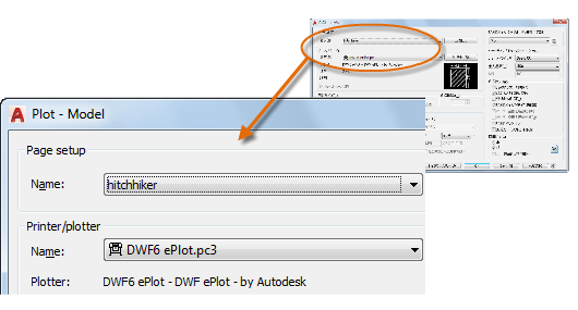 印刷する場合、[印刷]ダイアログ ボックスでページ設定の名前を指定するだけで、その印刷設定のすべてが呼び出されます。次の図では、[印刷]ダイアログ ボックスは、プロッタではなく DWF (Design Web Format)ファイルへの出力用である[Hitchhiker]ページ設定を使用するように設定されています。