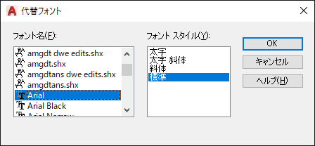 代替フォントを指定していない場合、開こうとしている図面ファイルで使用されているいずれかのフォントが見つからないとき、それぞれの見つからないフォントについて代りに使用するフォントを指定するためのダイアログ ボックスが表示されます。