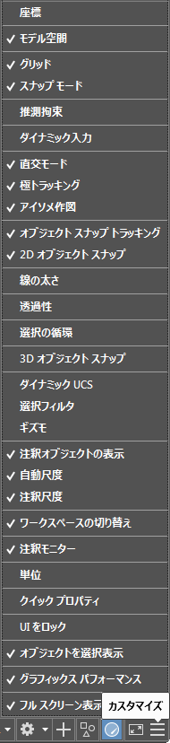 座標表示は、既定ではステータス バーに表示されません。ステータス バーに座標を表示するには、ステータス バーの[カスタマイズ]ボタンから[座標]を選択します。