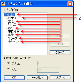 製図規格に関連付けられた寸法スタイルは、基本寸法スタイル(図の 1)とサブスタイル(図の 2)からなります。基本寸法スタイルは、その規格の寸法の基本設定を定義し、サブスタイルは異なる寸法タイプのスタイルを明示的に定義します。ほとんどの場合、サブスタイルは基本スタイルと同じです。寸法スタイルに独自の特性を設定する必要がある場合、寸法スタイルの既定の設定に、基本寸法スタイルとは異なる設定を少なくとも 1 つは持っている場合もあります。