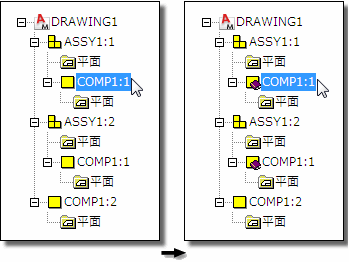 この例は、アセンブリ ASSY1 の 2 つのインスタンス、ASSY1:1 と ASSY1:2 が含まれる図面を示しています。COMP1 は、ASSY1 内(COMP1:2)だけでなく、外部(COMP1:1)にも出現します。ASSY1:1 で COMP1:2 を選択して参照コンポーネントにすると、ASSY1:2 の COMP1:2 も参照コンポーネントになります。これは、インスタンス COMP1:2 が、ASSY1:1 と ASSY1:2 で 1 回ずつ、合計 2 回出現するからです。ただし、インスタンス COMP1:1 は参照コンポーネントになりません。