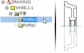 この例では、フォルダ Profile:1 に上位のホイール プロファイルが格納されています。Profile:2 はこのフォルダの別のインスタンスであり、Profile:1 をミラー化して作成しています。一方のプロファイルを変更すると、他方が自動的に更新されます。
