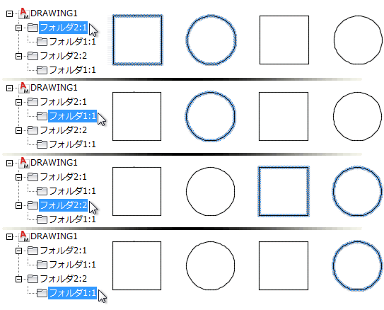 フォルダ 2:1 の下にネストされているフォルダ 1 に注目します。このインスタンスは、フォルダ 1:1 として識別されます。フォルダ 1:1 はフォルダ 2:2 の下にも存在します。これは、フォルダ 1 がフォルダ 2 の中にネストされており、フォルダ 2 のインスタンスを挿入すると、フォルダ 1 が自動的に出現するためです。つまり、インスタンス フォルダ 1 のオカレンスが 2 つあると言えます。