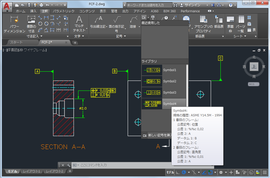 一部のシンボル ライブラリはリボンから簡単にアクセスできます。また、リボンのシンボル ライブラリから記号を直接挿入すると、AutoCAD Mechanical toolset でダイアログ ボックスが表示されることはありません。