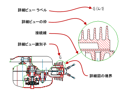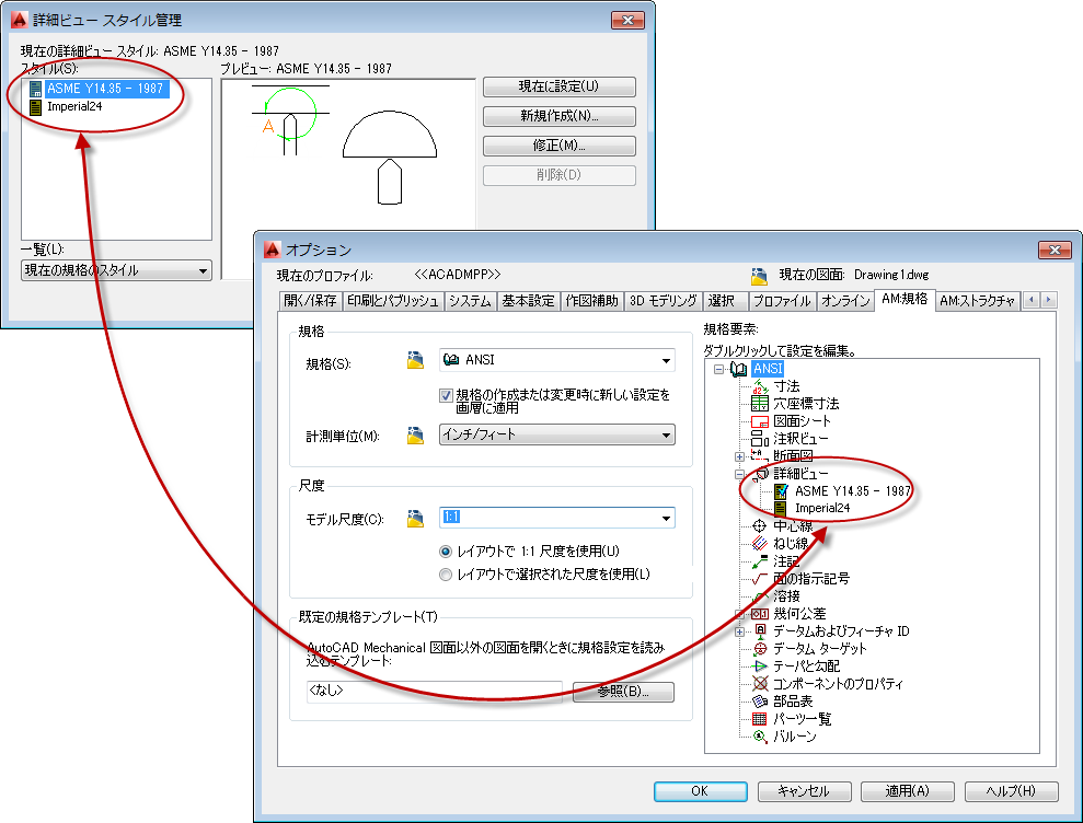 各詳細ビュー スタイルは、製図規格の履歴としてみなされます。AutoCAD Mechanical toolset の詳細ビュー スタイルは