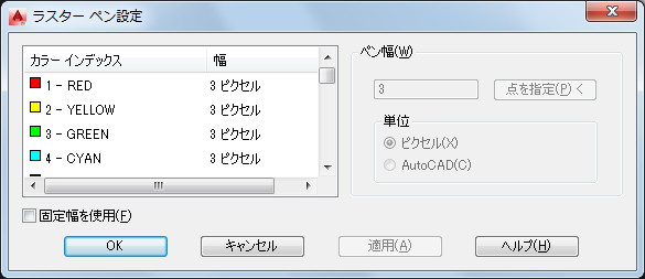 [ラスター ペン設定]ダイアログ ボックスでペンの太さを指定することにより、ベクトル合成で使用されるラスター ペンの幅を選択することができます。