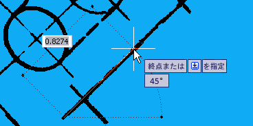 ダイナミック入力は、便利な場所でプロンプトを表示します。図では、カーソルを移動するときに、線分の長さと角度を表示するプロンプトの例を示しています。さらに、線分の長さの数値を入力することもできます。