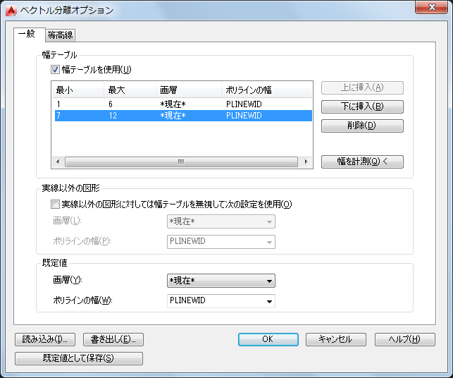 - [ベクトル分離オプション]ダイアログ ボックスの[一般]タブを使用して、ラスター線の線幅に基づいてベクトルを分離します。たとえば、太いオブジェクト線分から個別の画層へ細い寸法線を割り当てることができます。ラスター図形に対して 2 つまたはそれ以上の線幅範囲を指定し、各範囲に対して画層とポリライン幅を割り当てます。