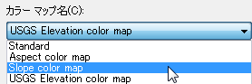 [パレット割り当てのカラー マップ]ダイアログ ボックスで、[Slope color map]を選択し、[適用]をクリックします。 これにより、マップ上のカラーが地形の勾配値の範囲を表します。 |