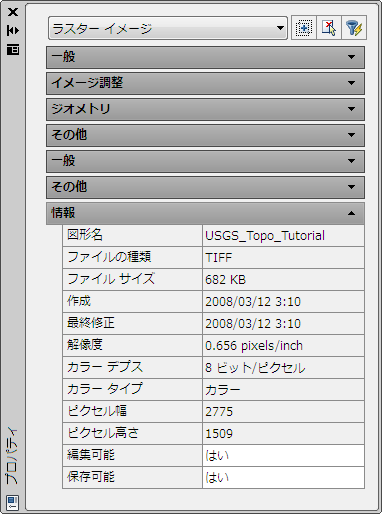 この例は、イメージを選択したときの[プロパティ]ウィンドウの外観を示しています。[ラスター イメージ]が選択されており、イメージ データが[情報]領域のプロパティ リストの最後に表示されています。