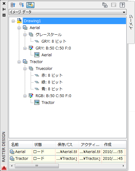 イメージ管理ツールスペースは、図面に関連付けられているイメージ データの構造を表示します。 このダイアログを使用して、イメージ ファイルの管理、その表示順序またはアクティブ パスの変更、カラー マップの編集、およびイメージの他の場所への書き出しを行うことができます。