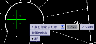 ツールチップ「1 点を指定または...」に下矢印アイコンが表示されます。キーボードの下矢印を 1 回押すと、[中央]と[3 点]の他の 2 つのオプションが確認できます。再び押すと、黒い点のマーカーが最初の選択項目に表示されます。