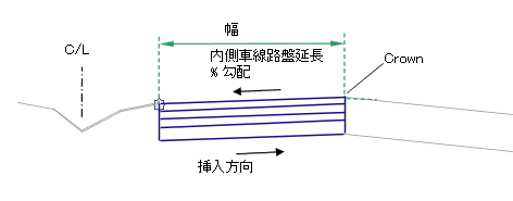 内側車線横断勾配摺り付け勾配を基線線形の横断勾配摺り付け仕様から取得し、値の正負を逆にします。左側に挿入する場合は、右外側車線の勾配を取得して正負を逆にし、右側に挿入する場合は、左外側車線の勾配を取得して正負を逆にします。アタッチメント ポイントから開始して、指定された幅、深さ、および符号を逆にした横断勾配摺り付け勾配の表層サーフェスおよびそれに平行な路床を挿入します。車線の両側は、垂直リンクで結ばれます。