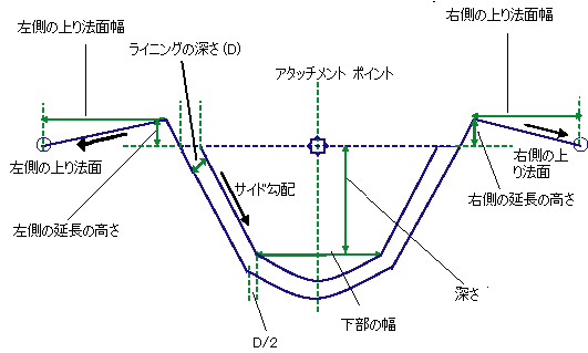 | 深さ | 縦断勾配線標高から水路の底部までの下方向の垂直オフセット | 数値、正 |