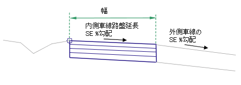内側車線横断勾配摺り付け勾配を基線線形の横断勾配摺り付け仕様から取得します。アタッチメント ポイントから開始し、指定された幅、深さ、および横断勾配摺り付け勾配の表層サーフェスおよびそれに平行な路床を挿入します。車線の両側は、垂直リンクで結ばれます。