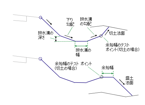排水溝の下り法面と排水溝テスト ポイントまでの排水溝のリンクを作成します。縦断が指定されている場合は、下り法面の幅を調整して排水溝の縦断を保持します。排水溝の深さは一定に保持します。排水溝テスト ポイントが切土に含まれる場合は、指定された[切土法面]を使用して、ターゲット サーフェス上で法面展開交点を計算します。排水溝テスト ポイントが盛土に含まれる場合は、余裕幅上部のリンクを追加し、指定された[盛土法面]を使用して、ターゲット サーフェス上で法面展開交点を計算します。[法面展開リンクを含まない]で[はい]が設定されている場合は、法面展開リンクは挿入されません。余裕幅上部のリンクがターゲット サーフェスと交差する場合は、その交点で横断は終了します。