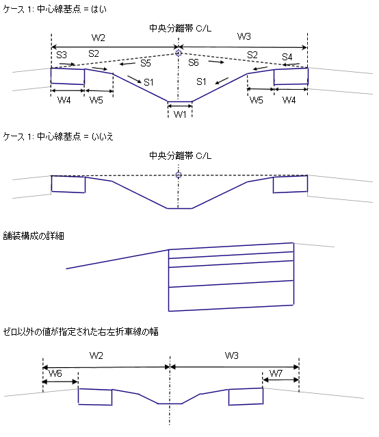 横断勾配摺り付けは、中心線のアタッチメント ポイントを基点にするものと、走行車線内端のアタッチメント ポイント標高を基点にするものとがサポートされています。路肩舗装部分の舗装構成は、Autodesk Civil 3D ヘルプの「舗装横断の舗装構成」で説明されている規格に従います。
