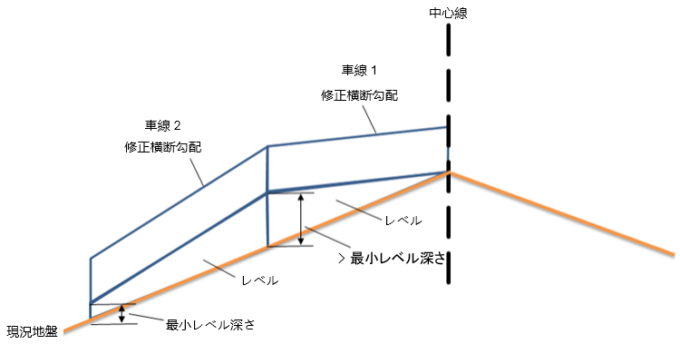 修正横断勾配が計算されて適用されますが、標高の調整やフラッピングは適用されません。場合によっては、最小レベルの深さが満たされないことがあります。