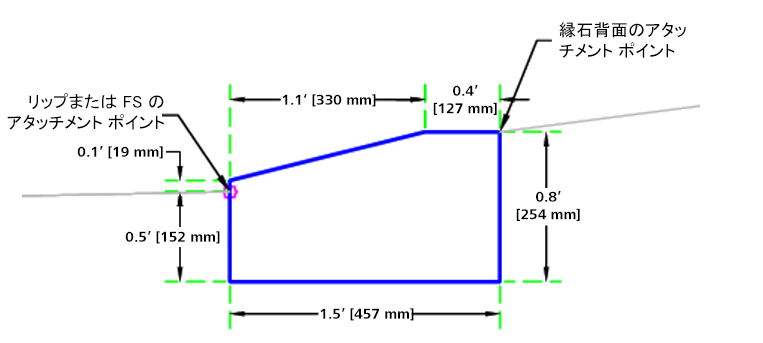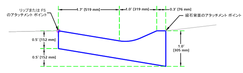 CaltransCurbs サブアセンブリは、Caltrans 標準プラン RSP A87A に基づいて縁石と側溝を作成するためのリンクを挿入します。