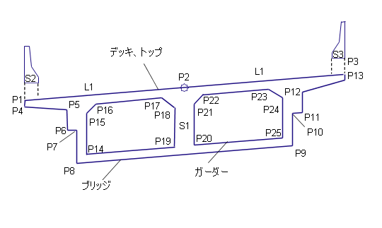 アタッチメント ポイントは、橋梁デッキの表層上における車線の分割線にあります。両側に橋梁の横断が作成されます。