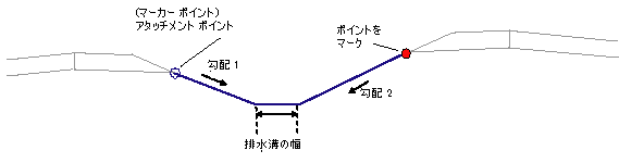 排水溝の幅がゼロ以外の場合は、マークされたポイント側の排水溝の端 |