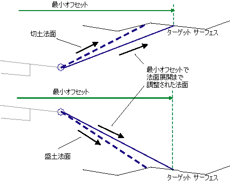 切土条件の法面展開ポイントを計算します。法面展開ポイントが検索されると、ポイントのオフセットを[最小オフセット]値と比較します。法面展開ポイントが[最小オフセット]より小さい場合は、ターゲット サーフェス上の最小オフセット ポイントに法面展開ポイントを移動します。切土条件の法面展開ポイントが検索されない場合は、盛土条件に対して、同じプロセスを繰り返します。