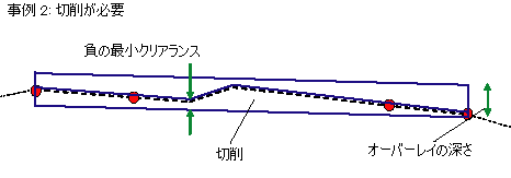 オーバーレイ層上面の位置を、内側トリム ポイント上のコリドー縦断標高の位置になるよう調整するか、または[最小クリアランス]の値に基づいて上下方向に調整するかを決定します。 |