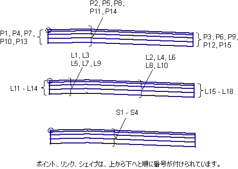 次の表は、このサブアセンブリのポイント、リンク、およびシェイプ コードのうち、コードが割り当てられているものを一覧表示しています。このサブアセンブリのポイント、リンク、シェイプ コードのうち、コードが割り当てられていないものは表に含まれません。