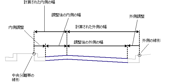 内側および外側調整: 内側または外側の端に使用されている線形が、実際の走行車線からの固定オフセットにある場合に 、[内側調整]および[外側調整]パラメータを指定します。たとえば、中央分離帯の端に使用されている線形が、舗装の端ではなく、縁石の背面にある場合があります。この場合、[内側調整]パラメータを縁石の幅に設定する必要があります。