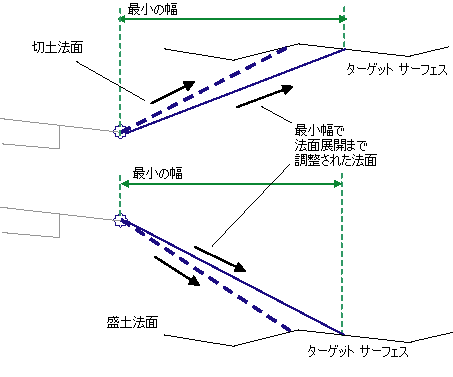 切土条件の法面展開ポイントを計算します。法面展開ポイントが検索されると、法面展開リンクの幅を[最小の幅]値と比較します。法面展開ポイントが[最小の幅]より小さい場合は、ターゲット サーフェス上の最小幅ポイントに法面展開ポイントを移動します。切土条件の法面展開ポイントが検索されない場合は、盛土条件に対して、同じプロセスを繰り返します。
