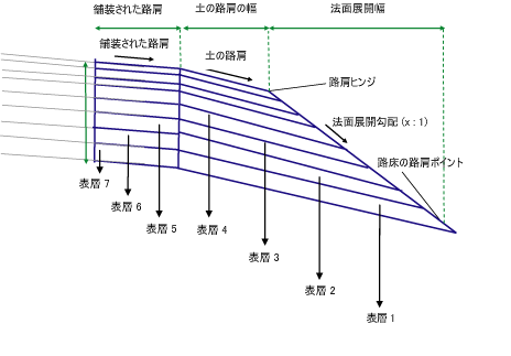 | 法面展開勾配 | 路肩ヒンジ ポイントから路床の路肩ポイントまで延びる路肩の表法勾配の勾配 | 勾配 | 2: 1 |