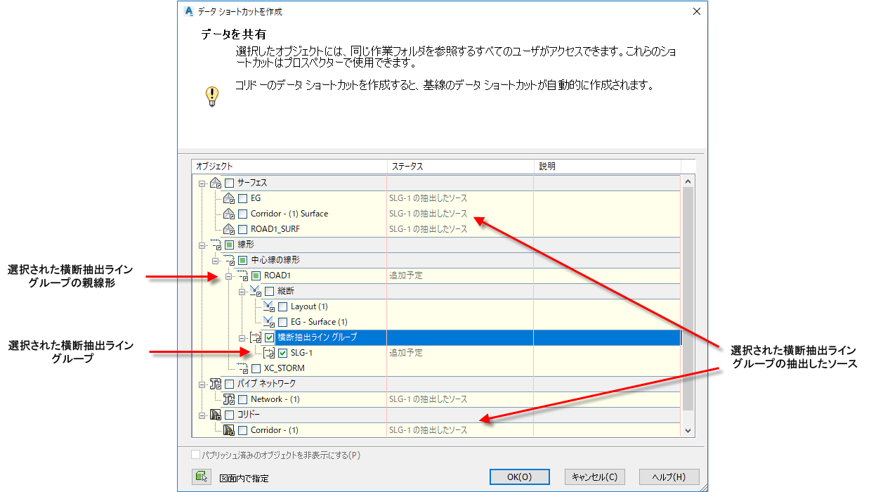 横断抽出ライン グループに対してデータ ショートカットを作成すると、[データ ショートカットを作成]ダイアログ ボックスの[ステータス]列に注記が表示され、図面内のどのアイテムが横断抽出ライン グループの抽出済ソースであるかが示されます。