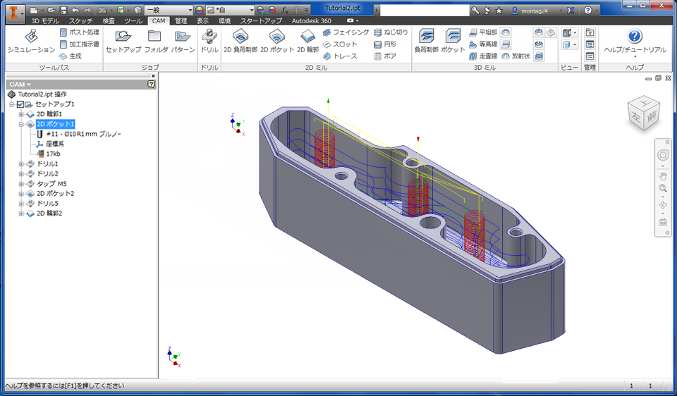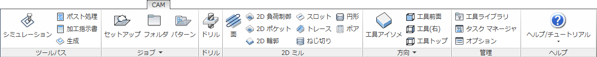 最初の加工操作を作成するには、[CAM]ツールバーからツールパス加工法のいずれかを選択します。必然的に必要となるツールパスの種類は、パーツの図形によって異なります。個々の加工方法の詳細については、Autodesk HSM のヘルプ トピック「2D 加工法について」および「3D 加工法について」を参照してください。