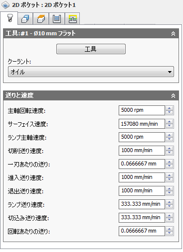 2D ポケット加工法の[操作]ダイアログ ボックスです。[工具]タブは既定でアクティブになっています。