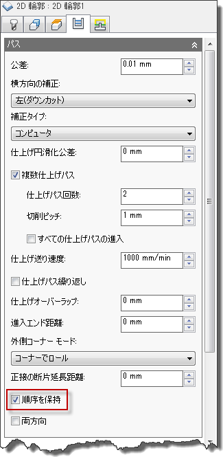 順序を手動でコントロールするには、個々の輪郭を加工する順序で選択し、[パス]タブで[順序を保持]チェック ボックスを有効にします。