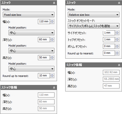- モデルの配置: ボトム(-Z)からのオフセット: 負の Z 方向にストックのオフセットを指定します。