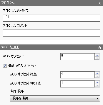 [複数 WCS オフセット]を有効にすると、インスタンスの合計数と使用するワーク オフセット増分値を指定することができます。また、複製したツールパスの順序(セットアップ別、操作別、工具別)も選択することができます。