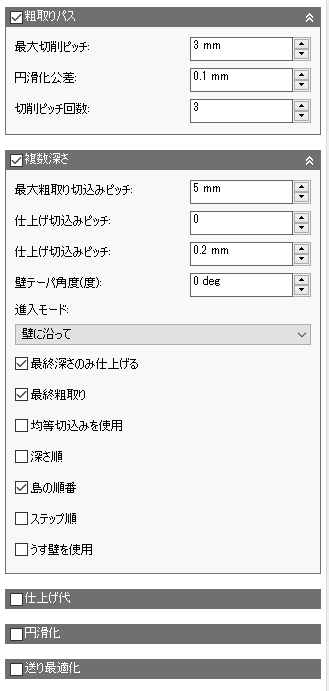 1 つまたは複数の仕上げ切込みピッチを使用して複数の深さを実行するときにすべての粗取りパス/仕上げパスに仕上げ切込みピッチを適用できます。