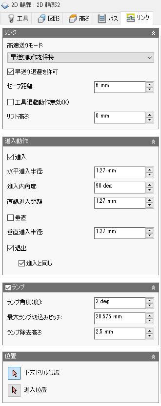 進入が進入からツールパスに移動するときに円滑化される垂直円弧の半径です。