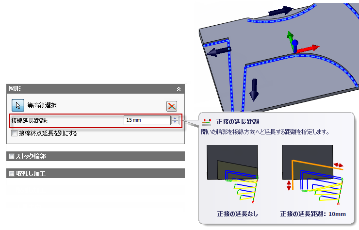 開いた輪郭の始点で 15 mm、終点で 5 mm に設定された接線延長距離