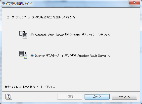- [ライブラリ ガイドを転送...]ボタンをクリックし、[ライブラリ ガイドを転送]ダイアログ ボックスを開きます。図 2 を参照してください。[Inventor デスクトップ コンテンツから Autodesk Vault Server へ]を選択します。
