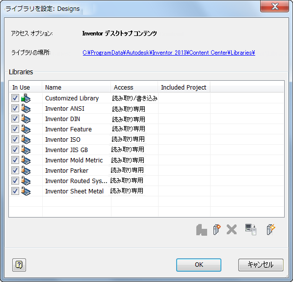 - [プロジェクト]ダイアログ ボックスで、[コンテンツ センター ライブラリの設定]ボタンをクリックし、[ライブラリを設定]ダイアログ ボックスを開きます。図 1 を参照してください。